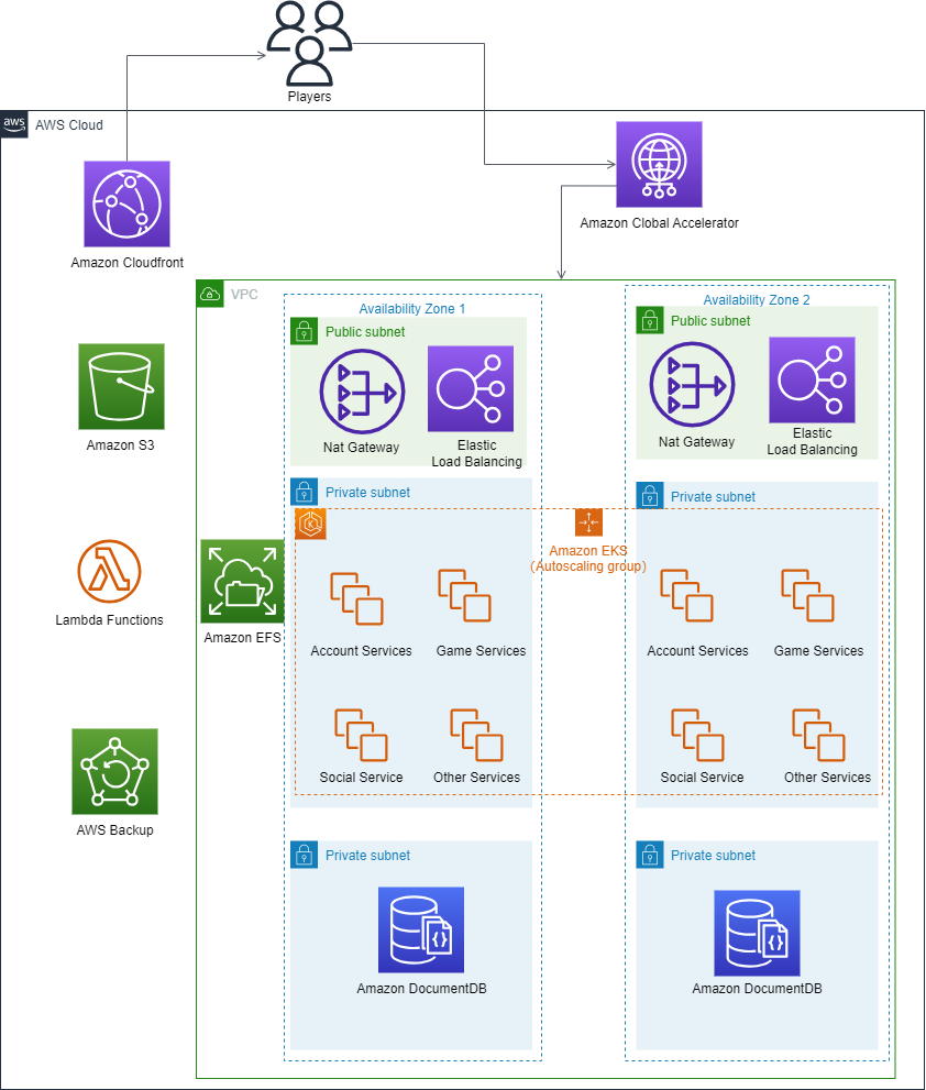 使用(yòng)的AWS雲服務(wù)包括Amazon EC2、Amazon S3、Amazon VPC、Amazon Nat Gateway、Amazon ELB、Amazon DocumentDB、EFS、EKS、Lambda、Backup、Global Accelerator、Amazon CloudFront等服務(wù)。